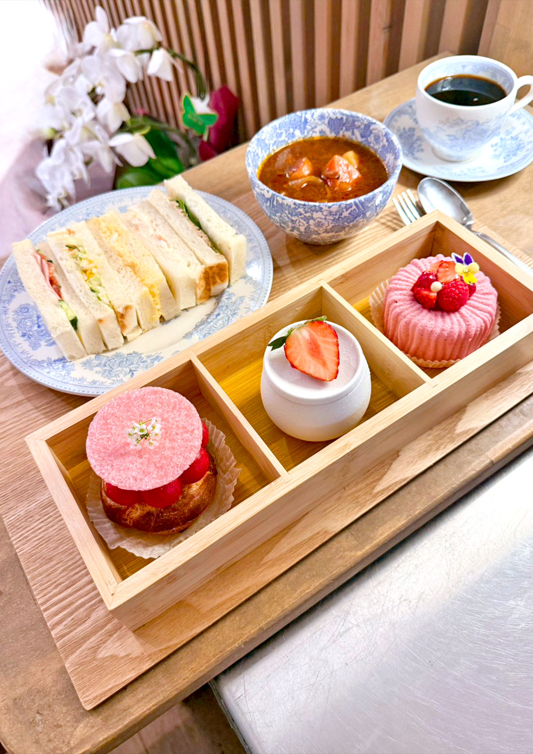 スイーツの皿スコーンの皿サンドイッチの皿と充実満腹のお楽しみヌン活です。(要予約)